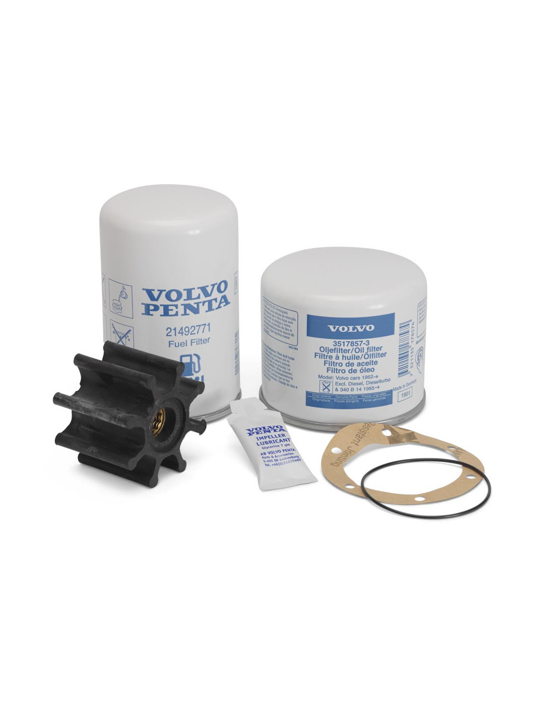 Kit de mantenimiento Volvo Penta para motores diesel. Contiene el filtro de aceite, el filtro de combustible y el rodete con las juntas necesarias. Los kits para los motores D4 y D6 incluyen también el filtro de aire y el filtro de derivación de aceite. Para el motor D4/D6 A-F (-2019) también va incluido el filtro de ventilación del cárter.