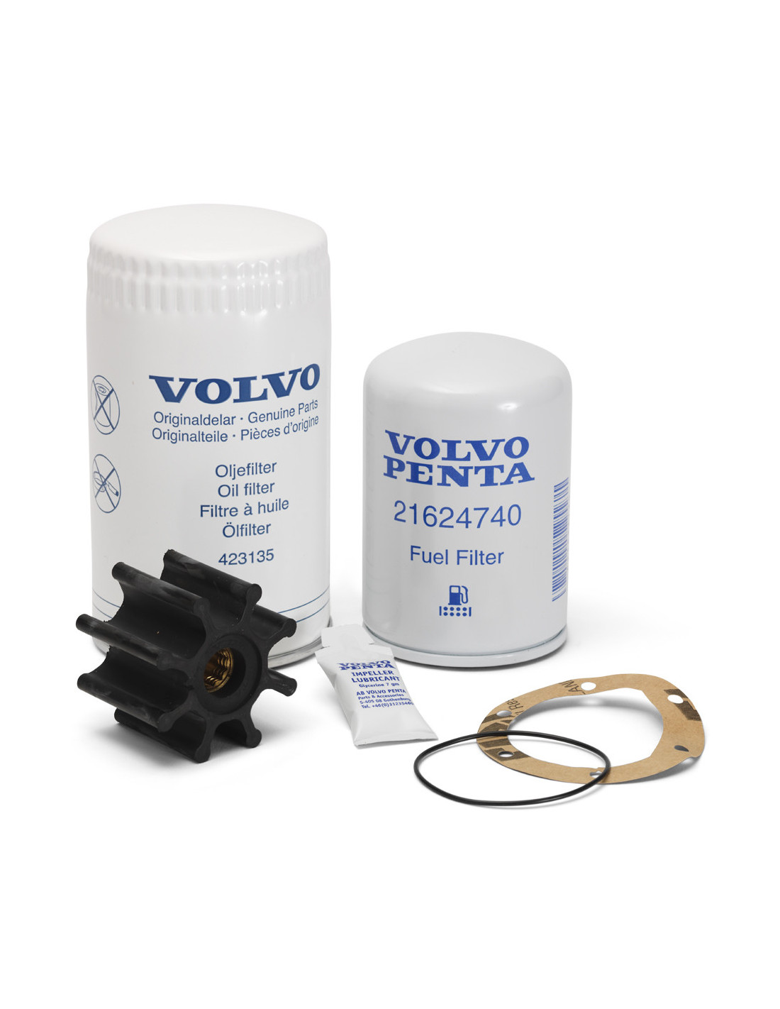 Kit de mantenimiento Volvo Penta para motores diesel. Contiene el filtro de aceite, el filtro de combustible y el rodete con las juntas necesarias. Los kits para los motores D4 y D6 incluyen también el filtro de aire y el filtro de derivación de aceite. Para el motor D4/D6 A-F (-2019) también va incluido el filtro de ventilación del cárter.