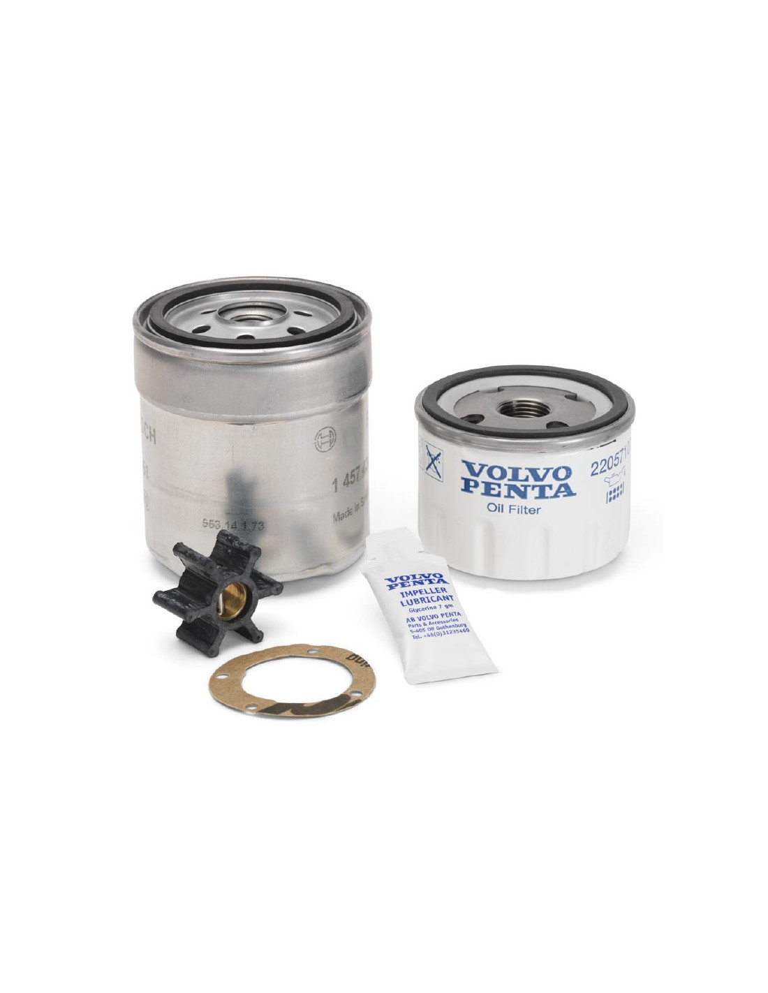 Kit de mantenimiento Volvo Penta para motores diesel. Contiene el filtro de aceite, el filtro de combustible y el rodete con las juntas necesarias. Los kits para los motores D4 y D6 incluyen también el filtro de aire y el filtro de derivación de aceite. Para el motor D4/D6 A-F (-2019) también va incluido el filtro de ventilación del cárter.