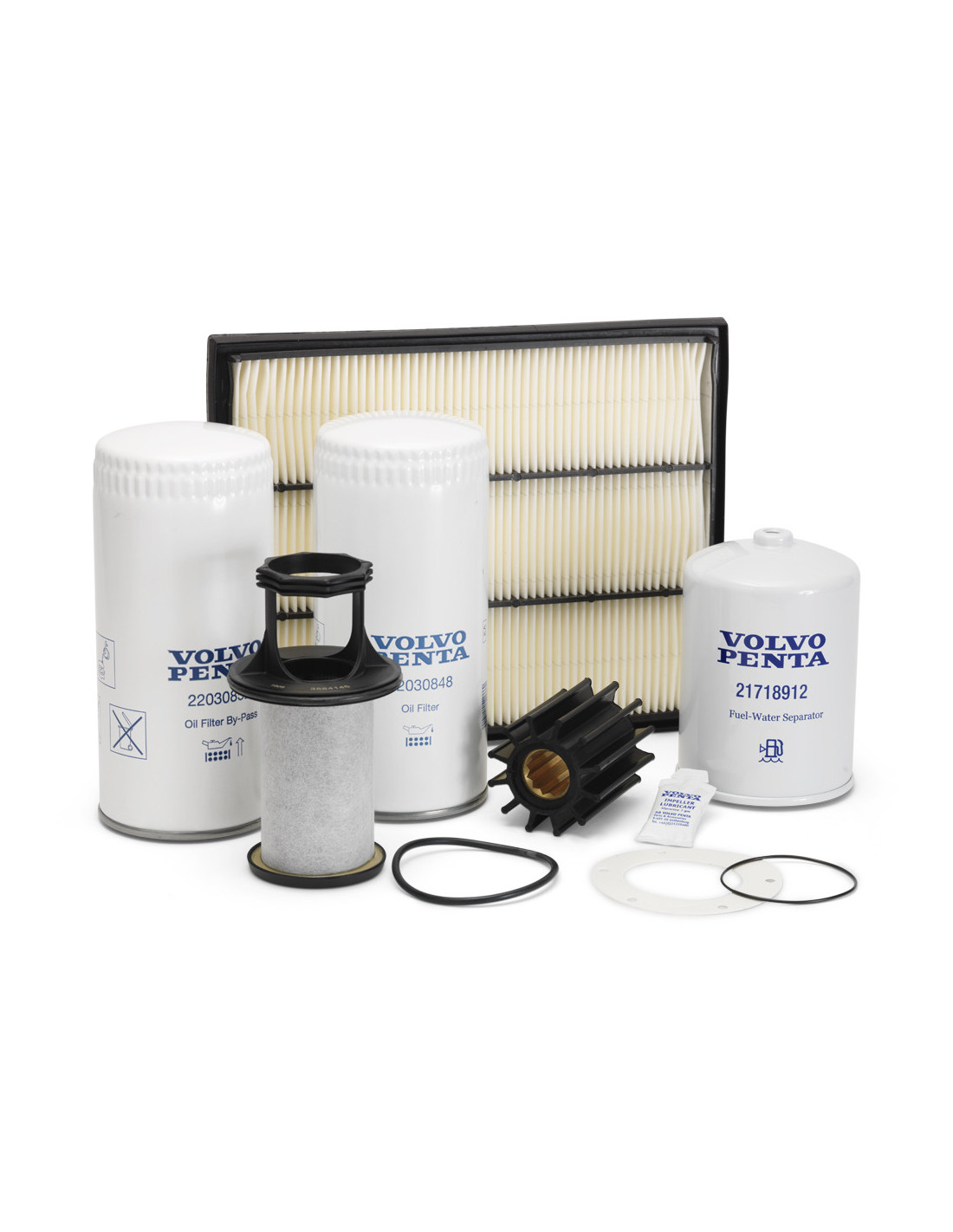 Kit de mantenimiento Volvo Penta para motores diesel. Contiene el filtro de aceite, el filtro de combustible y el rodete con las juntas necesarias. Los kits para los motores D4 y D6 incluyen también el filtro de aire y el filtro de derivación de aceite. Para el motor D4/D6 A-F (-2019) también va incluido el filtro de ventilación del cárter.