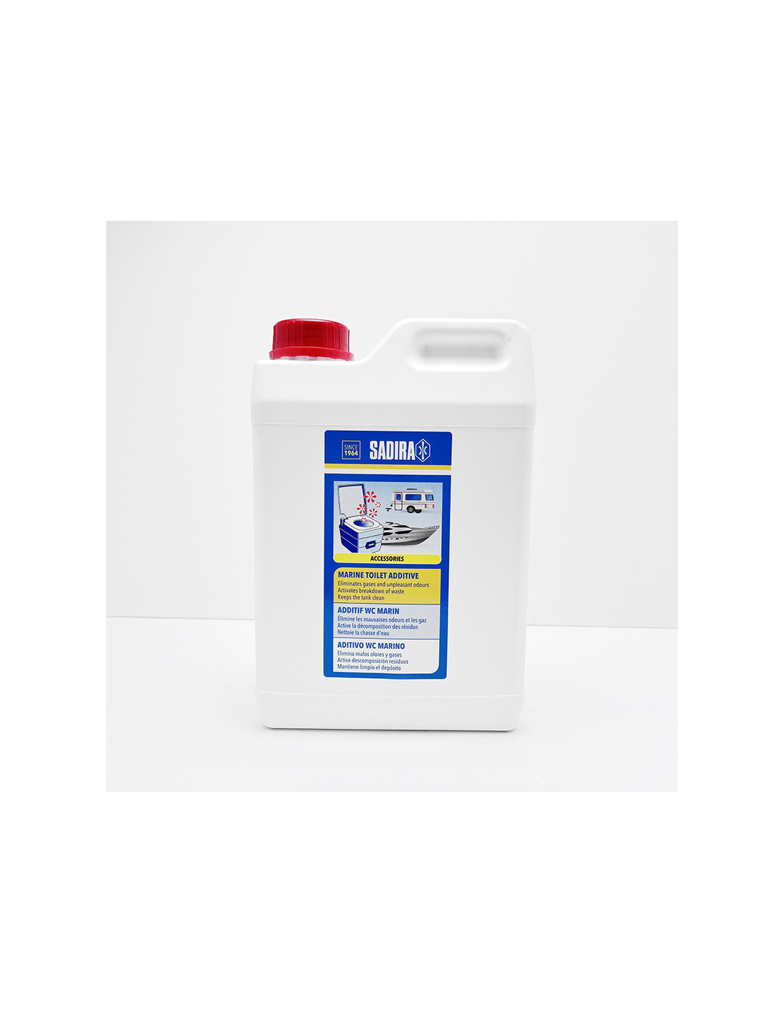 Aditivo WC marino Sadira en envase de 2 litros. Elimina malos olores y gases. Activa descomposición de residuos. Mantiene limpio el depósito. Ref. 4075